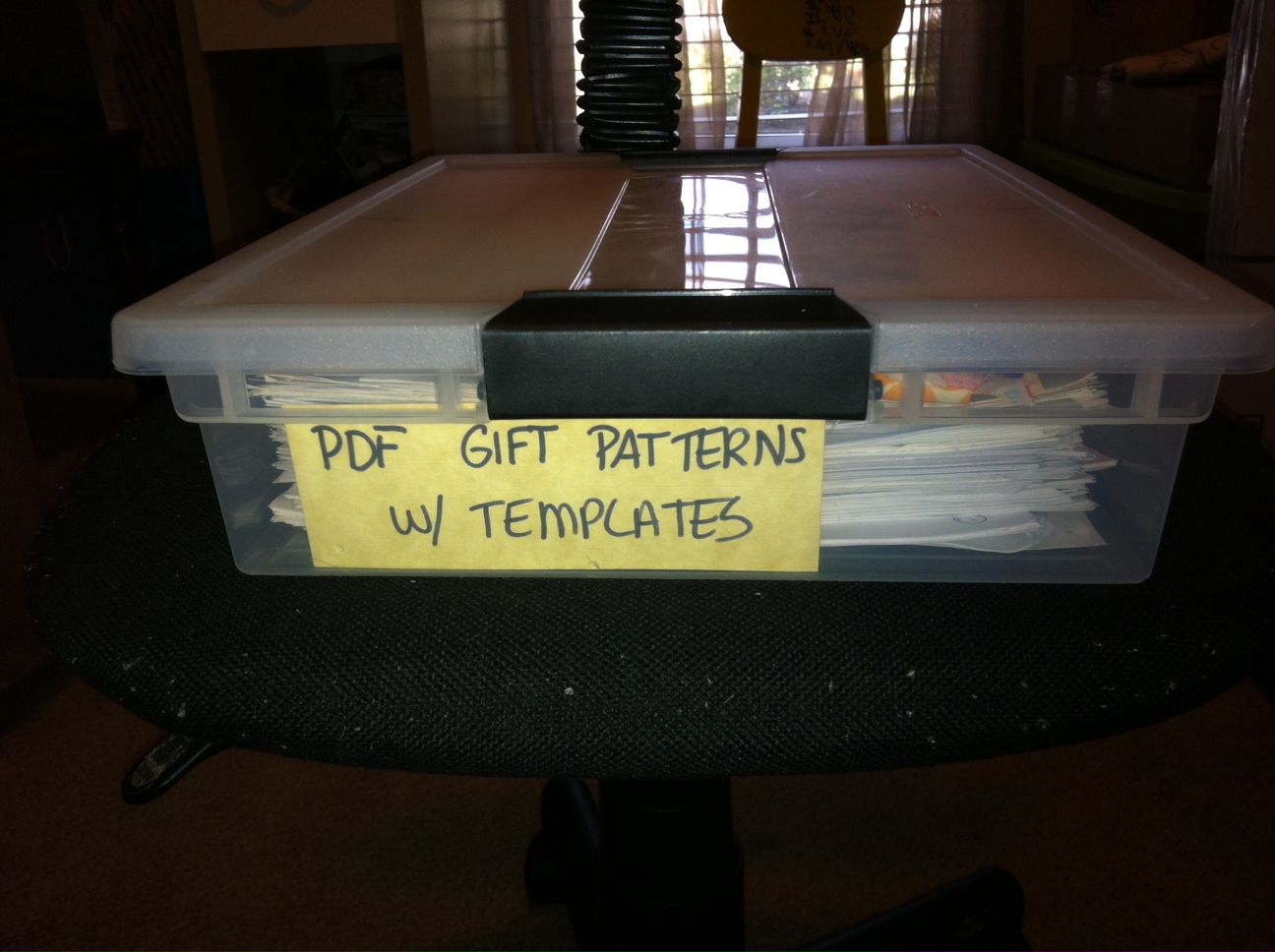 Here's a pic of my PDF patterns with their templates attached stored in above pictured bin. This system works great for me. My larger pattern template storage ideas will be discussed when we delve into the Template Storage chapter.